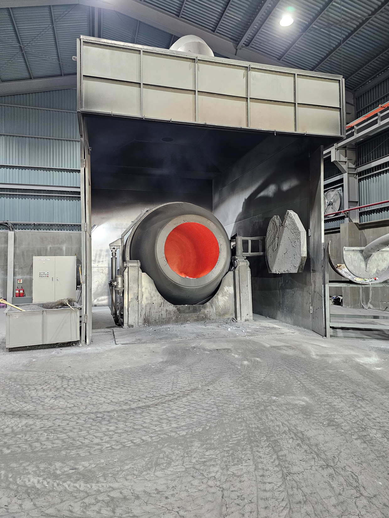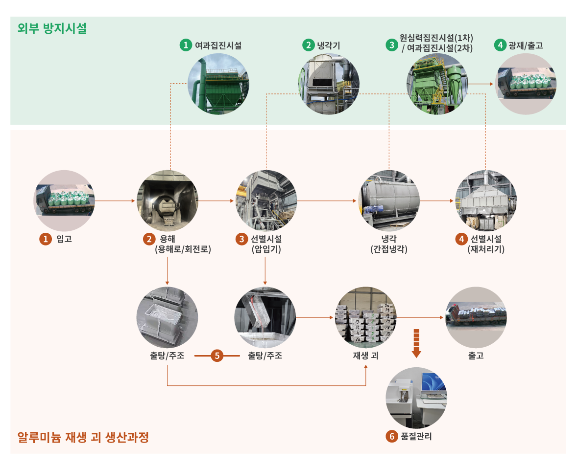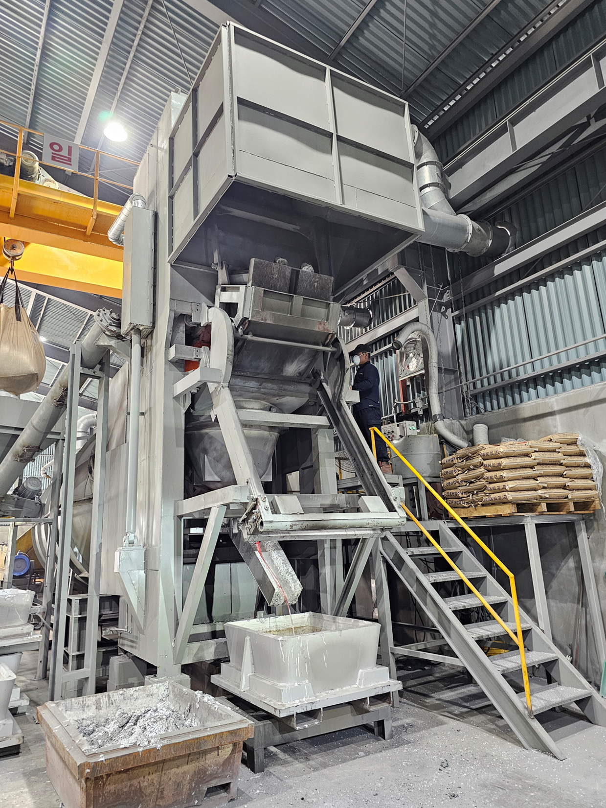- 용해로(회전로)에서 용해 후 용탕 위로 떠오르는 재를 선별시설에 담아
